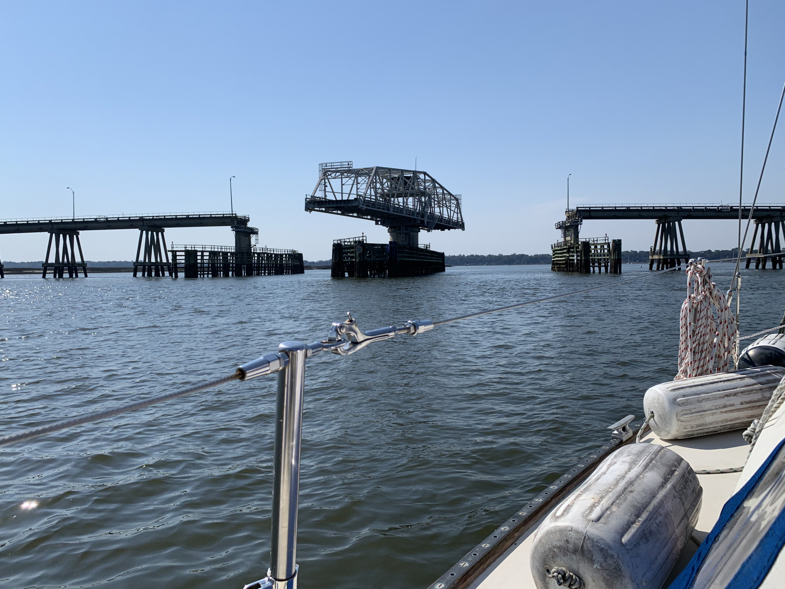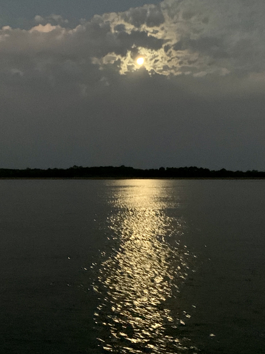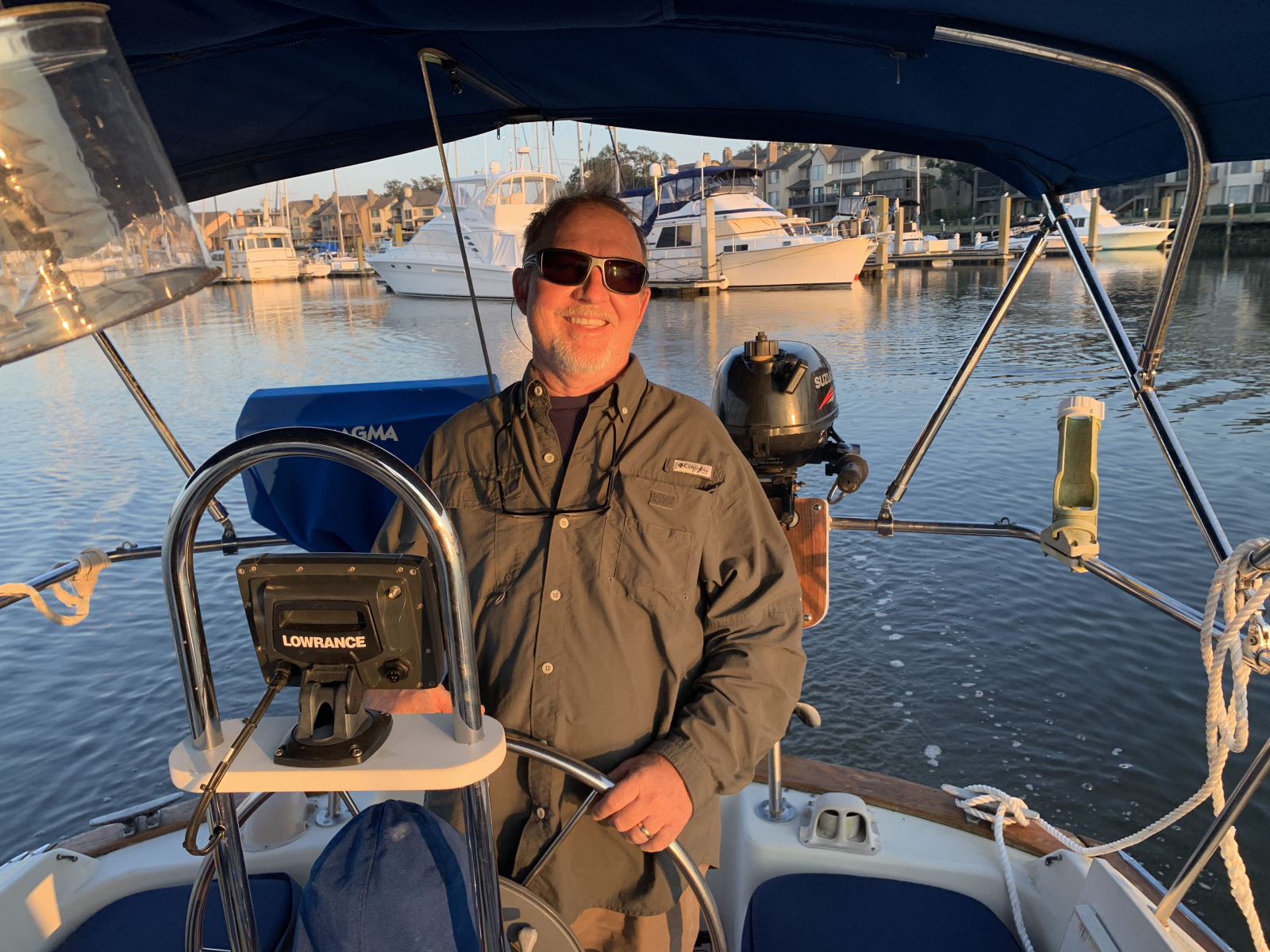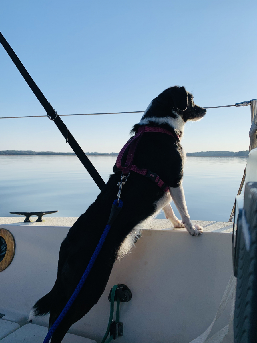 Now that we have a hotspot we can resume posting on our blog!! We have cast the lines and are heading south on Luckydog! The cruising dream was instilled in Marcus at an early age by his dad Will Simmons. He bought a little wooden boat, fixed it up and took the family sailing. Marcus fell in love with the idea that you could get in a sailboat and go anywhere you wanted! He also liked the fact that it takes a little technical skill like riding a bicycle or flying a glider. To him, sailing is fun! We departed Bohicket Marina on Thursday, February 25th around 5PM and anchored in beautiful Steamboat Creek for the evening. Friday morning we pulled up anchor and continued our journey, passing the quaint waterfront community of Beaufort, South Carolina and anchored in a small creek across the waterway from the Parris Island Marine Base. We enjoyed an amazing sunset and could actually hear "Colors" being played as the flags were being lowered on the base. Thank you so much to the men and women who have served and continue to serve in our Armed Forces! Saturday morning we enjoyed another fabulous sunrise as we continued our journey, passing Hilton Head and Savannah. We never realized the beauty of coastal Georgia until now! We stopped for fuel and ice Saturday afternoon and Seaby and Skipper were quite happy to stretch their legs and sniff some new scents! They have adapted quite well to life on a sailboat! Saturday evening we slipped into a lovely anchorage in Redbird Creek, south of Savannah. The shorebirds welcomed us with their calls and the dolphin swam by to check us out! The timing was perfect as we enjoyed watching an amazing full moon rise above the marsh! We woke up this morning to a blanket of fog that had settled around us allowing us to enjoy a leisurely breakfast while waiting for it to lift. The skies cleared quickly and we continued heading south through the winding rivers of coastal Georgia. There are some areas that the ICW turns into a "ditch" with challenging shoals and narrow paths. One of these areas is appropriately called "Hell's Gate"! We are now anchored in a sweet little spot on the North River anticipating another spectacular sunset! The tides should be favorable in the morning as we have to maneuver down a section called "Muddy Creek", surrounded by shoals and narrow passages. Now it's time to sit back, relax and breathe!