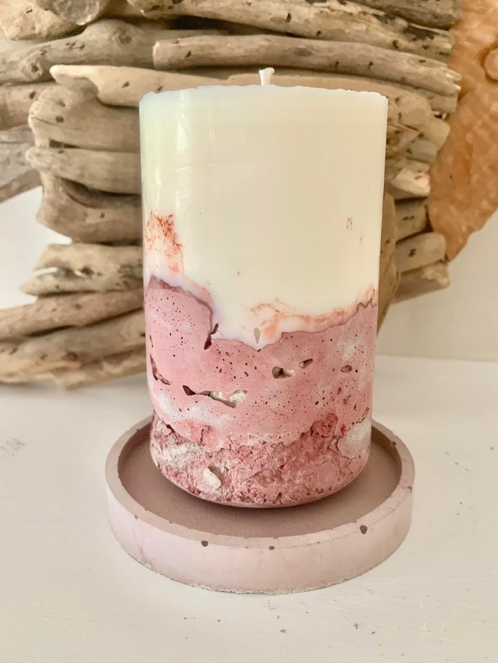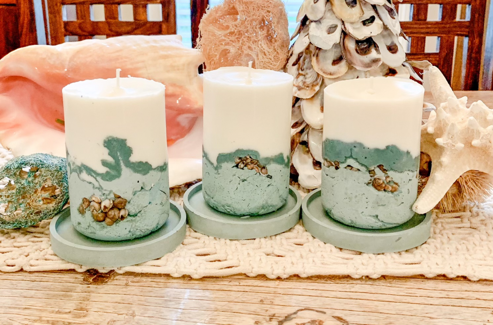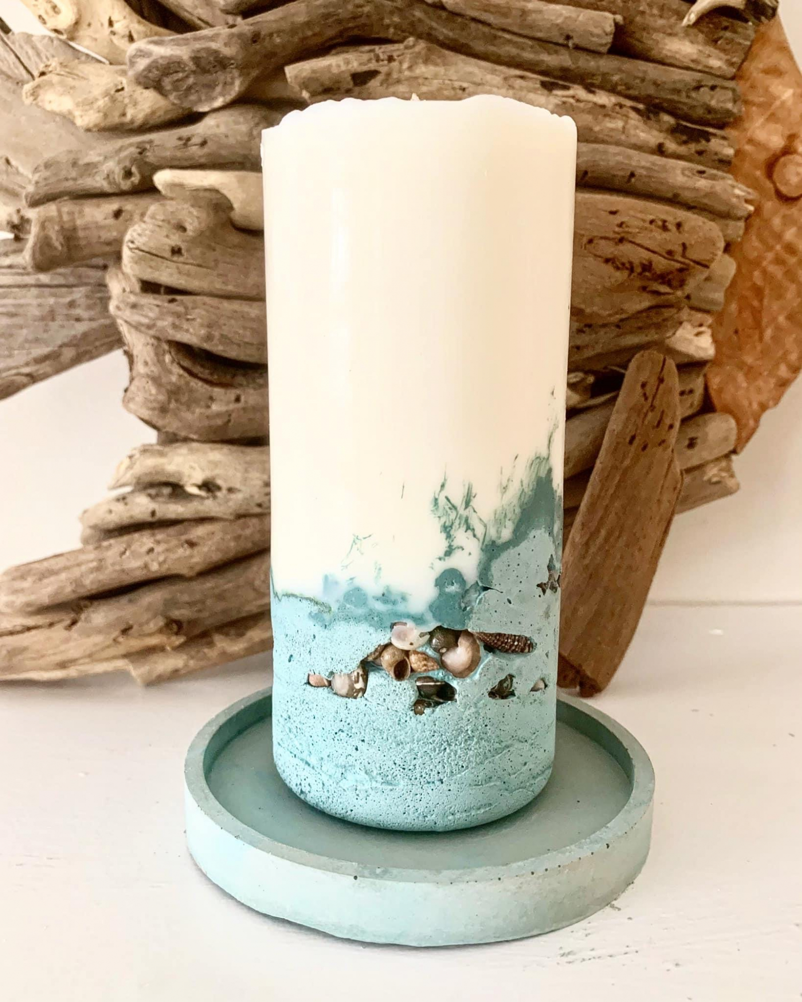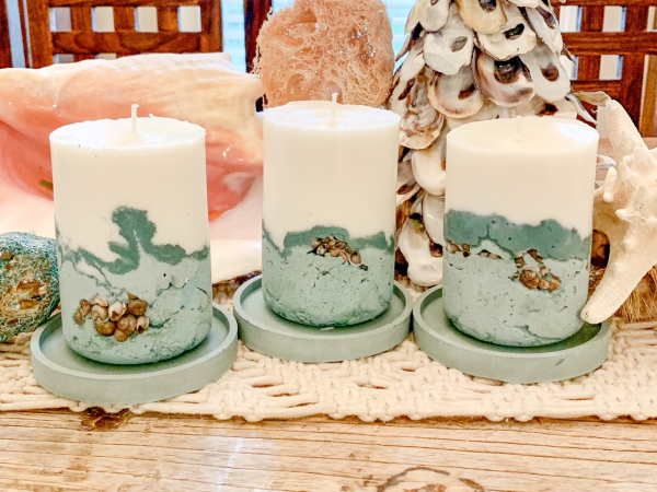 Enjoy the ambiance of the coast with our beachy concrete candle pillars embedded with beautiful tiny seashells!   We can also embed our concrete with tiny pebbles to create a textured organic vibe!  These candles are custom made to order.